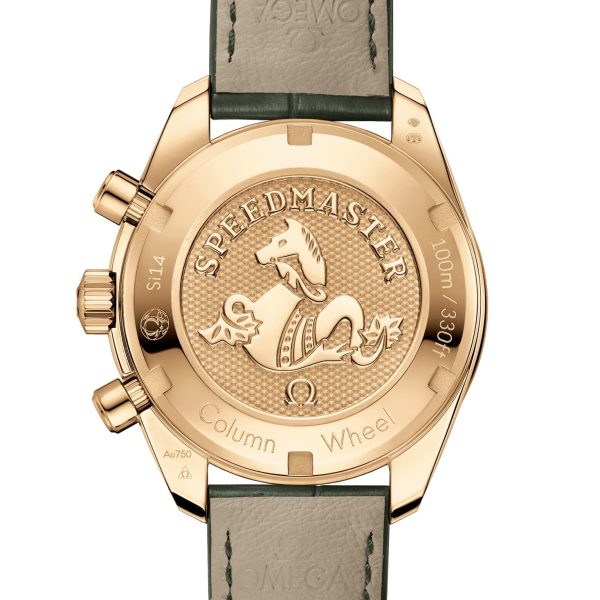Unworn Omega Speedmaster ANNIVERSARY SERIES CHRONOGRAPH 311.63.40.30.02.001. 39.7 mm, Opaline silvery dial, Sedna™ gold case, Brown polished ceramic bezel ring and a matt chromium nitride tachymeter scale, 1861 calibre, Manual winding Movement, 18 jewels, 48 hour power reserve, Brown leather strap with Buckle clasp. Water resistant to 50 m.