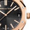 Unworn Audemars Piguet Royal Oak SELFWINDING “50TH ANNIVERSARY” 15510OR.OO.D002CR.01. 41 mm, Black dial with “Grande Tapisserie” pattern, pink gold applied hour-markers and Royal Oak hands with luminescent coating, 18-carat pink gold case, glareproofed sapphire crystal and caseback, screw-locked crown, 4302 calibre, Selfwinding movement, 70 h power reserve, 32 jewels, Black alligator strap with 18-carat pink gold AP folding clasp. Water resistant to 50 m.