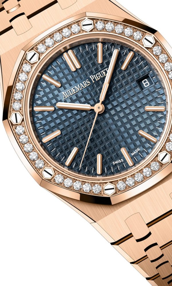 Unworn Audemars Piguet Royal Oak SELFWINDING “50TH ANNIVERSARY” 15551OR.ZZ.1356OR.02. 37 mm, Bleu nuit nuage 50 dial with “Grande Tapisserie” pattern, pink gold applied hour-markers and Royal Oak hands with luminescent coating, 18-carat pink gold case, bezel set with brilliant-cut diamonds, glareproofed sapphire crystal and caseback, 5900 calibre, Selfwinding movement, 60 h power reserve, 29 jewels, 18-carat pink gold bracelet with AP folding clasp. Water resistant to 50 m.