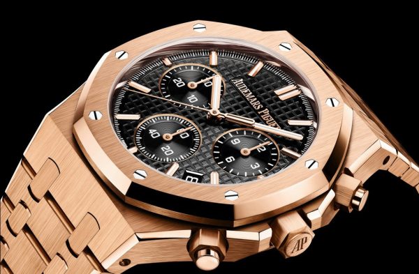 Unworn Audemars Piguet Royal Oak SELFWINDING CHRONOGRAPH “50TH ANNIVERSARY” 26240OR.OO.1320OR.02. 41 mm, Black dial with “Grande Tapisserie” pattern, black counters, pink gold applied hour-markers and Royal Oak hands with luminescent coating, 18-carat pink gold case, glareproofed sapphire crystal and caseback, screw-locked crown, 4401 calibre, Selfwinding movement, 70 h power reserve, 40 jewels, 18-carat pink gold bracelet with AP folding clasp. Water resistant to 50 m.