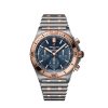 Breitling Chronomat B01 42 watch, case brushed and polished stainless steel and 18k Red Gold, Reference UB0134101C1U1. The model has blue dial with blue sub-dials and an 18k Red Gold “B” emblem below the 12 o’clock position. This watch applied polished 18k Red Gold index hour markers with luminous fill and polished 18k Red Gold hands with luminous fill. Blue dial flange with Tachymeter scale and fine printed minute/seconds track intervals on the outer perimeter dial. Date window located at the 6 o’clock position. Small seconds sub-dial at 9 o’clock. The dial closed by a Cambered Scratch-resistant Sapphire Crystal with glare-proofed both sides. Of Sapphire Crystal made transparent case back. The watch has polished 18k Red Gold screw-locked crown with two gaskets. The crown has a ribbed edge for a comfortable grip and Breitling logo. On the right side case also houses the 18k Red Gold chronograph buttons a cylindrical shape. Chronograph/Stopwatch functions: column wheel mechanism; large red central seconds counter hand; 30-minute counter sub-dial located at the 3 o’clock position; 12-hour counter sub-dial at the 6 o’clock position. The watch is equipped polished 18k Red Gold unidirectional-ratcheted rotating bezel ring with brushed finished 1/4 hour rider tabs. The Model comes with Breitling Caliber B01 contains 47 Jewels and has an approximate power reserve of 70 hours. The watch presented on the Rouleaux Bracelet brushed and polished Stainless Steel with 18k Red Gold links with Push Button Folding Clasp. The water resistance is up to 200m/660ft.