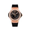 Hublot Big Bang Gold Diamonds 38mm watch, polished and satin-finished 18kt Rose Gold case, Reference 361.PX.1280.RX.1104. Case center (edge) lateral black composite resin inserts. This model has Solid black metallic black dial with a fine sunburst texture. Applied brushed finished 18kt Rose Gold “applique” style alternating Arabic Numerals and index hour markers. Brushed finished 18kt Rose Gold minute and hour hands with luminous filled tips and skeletonized bottoms. Printed minute track with 5-minute Arabic numerals intervals on flat black outer rim on the edge of the dial. 18kt Rose Gold Crown has a black rubber centers/inserts. The dial closed by a Scratch-resistant Sapphire Crystal with Anti-reflective Treatment. Solid 18K Rose Gold case back with logo Hublot. The watch is equipped fixed 18kt Rose Gold bezel set with 126 diamonds weighing +/- 0.87 carats, secured 6 immediately recognizable Hublots signature “H” screws style of Titanium. The watch is Hublot quartz/battery powered Caliber HUB 2900 with a validity period 3 to 5 Years. This model presented on a black Structured Lined Rubber Strap with 18K Rose Gold and Black-plated Stainless Steel Deployant Buckle Clasp. The water resistance is up to 100m/330ft (10 ATM).