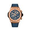 Hublot Big Bang Unico King Gold Blue, 42mm watch. 18k King Gold case, satin/brushed finished with fine polished corners, Reference 441.OX.5189.RX. This model has Matte Blue Skeleton dial with applied applique style alternating King Gold Arabic numerals and index hour markers with luminous fill. Black composite resin bezel lug and case band. Blue dial flange with a Rose Gold-tone minute/seconds track. Rose Gold-tone Arabic numeral minute markers at 5-minute interval. Bold Rose Gold -tone brushed finished hands with luminous fill (minutes and hours hands semi-skeleton). Small running seconds sub-dial hand located at the 9 o’clock position. Date window located between the 3 o’clock positions. Screw-down 18k King Gold crown with black rubber grip. 18k King Gold round shaped chrono buttons. The dial closed by a Scratch-resistant Sapphire Crystal with Anti-reflective Treatment. Of Sapphire Crystal made transparent case back. Chronograph stopwatch functions: column wheel chronograph mechanism; features a Flyback function, which allows instant restarting of the chronograph with a single push of the button; large central seconds counter with the “H” logo as a counter-weight; 60-minute counter sub-dial at 3 o’clock. The watch is equipped fixed satin-finished and polished 18k King Gold bezel, secured 6 immediately recognizable Hublots signature “H” screws style of Titanium. The watch is Hublot Caliber HUB 1280 UNICO Manufacture Self-winding Chronograph Flyback Movement with Column Wheel automatic movement, contains 43 Jewels and has an approximate power reserve of 72 hours. This model presented on a Blue Structured Lined Rubber Strap with 18K King Gold and Black-plated Titanium Deployant Buckle Clasp. The water resistance is up to 100m/330ft (10 ATM).