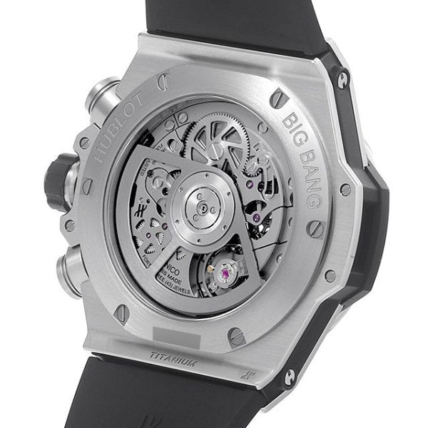 Hublot Big Bang Unico Titanium, 44mm watch, brushed titanium case with polished finished beveled corners, Reference 421.NX.1170.RX. Case sides and bezel base black composite resin inserts. This model has Matte Black Skeleton Dial with “Applique” style alternating Arabic Numerals and index hour markers with luminous fill. Raised/tapered black inner bezel flange on the perimeter of the dial with white printed minute/seconds track and printed 5 seconds increments in Arabic numerals. The silver-tone minute and hour hands with luminous filled tops and skeletonized bottoms. Date window with white background located at the 3 o’clock position. Small running seconds sub-dial hand located at the 9 o’clock position. Chronograph/Stopwatch functions: column wheel chronograph; Flyback function, allows for instant restarting of the chronograph with a single push of the button; large central seconds counter hand; 60-minute counter sub-dial located at the 3 o’clock position. The chronograph is adjusted using Titanium round shaped buttons. Titanium crown with function Screw down with black rubber around for enhanced grip. The dial closed by a Scratch-resistant Sapphire Crystal with Anti-reflective Treatment. Of Sapphire Crystal made transparent case back. The watch is equipped fixed brushed and polished titanium bezel, secured 6 immediately recognizable Hublots signature “H” screws style of Titanium. The watch is Hublot Caliber UNICO 2 HUB1280 Manufacture Self-winding Chronograph Flyback Movement with Column Wheel, contains 43 Jewels and has an approximate power reserve of 72 hours. This model presented on a black Structured Lined Rubber Straps with Titanium Deployant Buckle Clasp. Straps are easily interchangeable via the quick-release buttons, located on the top and bottom central lugs (this watch is delivered with a single strap only). The water resistance is up to 100m/330ft (10 ATM).