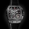 Hublot Spirit of Big Bang Titanium 45mm watch. Brushed/satin finished titanium case with polished beveled corners, Reference 601.NX.0173.LR. This model has Sapphire crystal transparent dial with bold brushed finished Stainless Steel minute and hour hands with luminous filled top and skeletonized bottoms. Applied brushed Stainless Steel ‘Applique’ index hour markers with luminous fill. Black inner bezel flange at the dial perimeter with a red minute/seconds track. Small running seconds sub-dial hand located at the 9 o’clock position. Visible skeletonized date wheel. Current date displayed between the 4 and 5 o’clock position, highlighted by a black background and a blue border. Chronograph Stopwatch function: large central seconds counter with the “H” logo as a counter-weight; black-rimmed 30-minute sub-dial counter located at the 3 o’clock position; black-rimmed 12-hour sub-dial counter located at the 6 o’clock position. Brushed and polished titanium crown and chrono buttons with black insert. The crown has Pull / Press function, the Hublot logo engraved on it. The dial closed by a Scratch-resistant Sapphire Crystal with Anti-reflective Treatment. Of Sapphire Crystal made transparent case back. The watch is equipped fixed titanium bezel with Microblasted (dark shade of finishing) recessed zones, secured with 6 polished “H” style Titanium screws. Lateral case center band and bezel lugs of black composite resin. The watch is self-winding Skeleton Chronograph Movement Hublot Caliber HUB 4700, contains 31 Jewels and has an approximate power reserve of 50 hours. This model presented on a Black “Gummy-Alligator” strap: Alligator on the top-side and rubber on the underside and edges with Titanium Deployant Buckle Clasp. The water resistance is up to 100m/330ft (10 ATM).