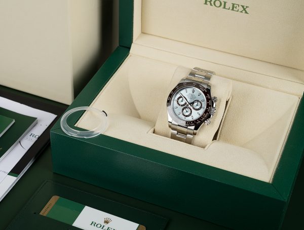 Rare and precious, platinum is striking for its silvery whiteness and vibrant luminosity. It is among the densest and heaviest metals in the world, distinguished by unique chemical and physical properties such as exceptional corrosion resistance. Paradoxically, it is also soft, elastic and highly malleable, which makes machining and polishing especially difficult, demanding an extremely high degree of skill. Rolex always uses 950 platinum, an alloy consisting of 950‰ (thousandths) platinum, painstakingly crafted in-house by the fine metalworkers at Rolex. The noblest of metals for the finest of watches.