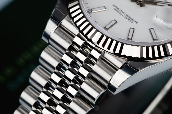 The Rolex fluted bezel is a mark of distinction. Originally, the fluting of the Oyster bezel had a functional purpose: it served to screw the bezel onto the case helping to ensure the waterproofness of the watch. It was therefore identical to the fluting on the case back, which was also screwed onto the case for waterproofness, using specific Rolex tools. Over time, the fluting became an aesthetic element, a genuine Rolex signature feature. Today the fluted bezel is a mark of distinction, in gold on this Datejust 41.