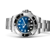 The 60-minute graduated, unidirectional rotatable bezel of the Rolex Deepsea enables divers to precisely and safely monitor their dive and decompression times. It is equipped with a patented black Cerachrom bezel insert manufactured by Rolex in a virtually scratchproof ceramic whose colour is unaffected by ultraviolet rays. The graduation is coated via PVD (Physical Vapour Deposition) with a thin layer of platinum. The sleek black dial features large Chromalight hour markers and hands, filled with luminescent material that emits a long-lasting blue glow for excellent legibility in dark conditions.