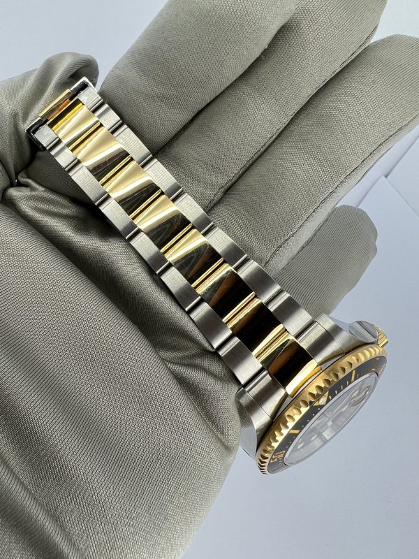 Rolex Sea-Dweller, 43mm watch of polished Stainless Steel and 18k Yellow Gold. This model has black dial with a polished 18k Yellow Gold hour, minute and seconds hands in Mercedes-logo and Breguet-style sword shape with luminous fill. Applied polished 18kt Yellow Gold rimmed doty and index hour markers with luminous fill. Fine printed minute/seconds track on the dial rim. Highly legible Chromalight display with long-lasting blue luminescence. Polished 18kt Yellow Gold patented “Triplock” locking crown ensuring that the crown screws down onto the Oyster case as securely as a submarine hatch. The dial closed by a Scratch-resistant Sapphire Crystal and solid case back made. The Watch has Centre hour, minute and seconds hands. Stop-seconds for precise time setting. Date window at 3 o’clock with a cyclops magnifier. The watch is equipped unidirectional rotatable polished 18k Yellow Gold bezel with knurled corners for enhanced grip. Black “Cerachrom” bezel insert, made of ceramic which is extremely hard, durable and highly scratch-resistant. Ceramic has excellent corrosion resistant properties and is unaffected by ultraviolet rays so the color will not fade. It features a 60-minute immersion scale engraved indexes and numbers with PVD yellow gold coated graduation with a luminous dot at the starting triangle. The movement is mechanical self-winding 3235, containing 31 Jewels and 70 hours of power reserve. The Rolex Oyster bracelet of brushed outer links Stainless Steel and polished center links 18k Yellow Gold with folding Oysterlock safety clasp with Rolex Glidelock extension system. The water resistance is up to 1220m/4000ft.