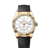 Unworn watch Rolex Sky-Dweller, 42mm, 18k Yellow Gold, Ref# 336238-0003. New for 2023, a true masterpiece of engineering. Elegant and versatile, this stunning timepiece is the perfect luxury accessory for the modern traveler. This superb chronometer features an Intense white dial, which is the perfect backdrop for the luminous 18k Yellow Gold index hour markers and hands, making it easy to read the time even in low light conditions. A well-readable minute scale is applied along the outer contour of the dial. The sophisticated multi-function display makes it easy to keep track of the time in two different time zones. The reference time is displayed in 24-hour format on an off-center dial, while the local time is read using the normal central hands. The annual calendar, named Saros, is powered by a patented mechanism and features an innovative display: the months of the year are shown in 12 windows around the circumference of the dial, behind the hour marker – the current month is displayed in red. The instantaneous date change is related to local time. The ribbed, easy-to-grip Triplock 18k Yellow Gold screw-down crown features a triple water-resistance system in and Rolex logo decorated. The dial is covered with a scratch-resistant sapphire crystal with anti-reflective coating and Cyclops lens at the 3 o’clock position. The fluted bezel in 18k Yellow Gold is a true hallmark of Rolex. Bidirectional rotatable, it is part of the Ring Command system and, when interacting with the crown, allows the user to select watch functions one by one and adjust them easily, quickly and simply. The model is powered by the innovative in-house Rolex mechanical movement, caliber 9002, contains 29 jewels and has an approximate power reserve of approximately 72 hours. This delightful watch is presented on an Oysterflex bracelet consisting of flexible metal blades coated with high performance elastomer, featuring a patented longitudinal cushion system that stabilizes the watch on the wrist, and fitted with an 18k Yellow Gold Oysterclasp clasp. It also features the Rolex Glidelock extension system, developed and patented by the brand. Water resistant up to 100m/330ft (10 ATM).