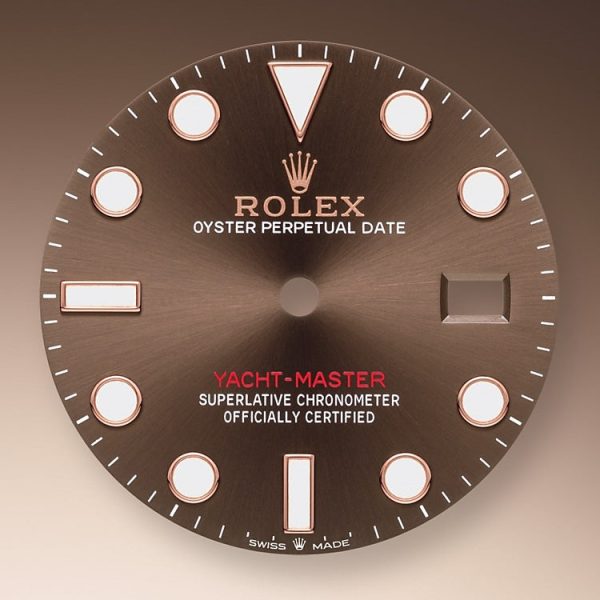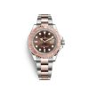 Rolex Yacht-Master 40 watch with Stainless Steel and 18k Everose Gold case. This model has Chocolate dial with a fine sunray. Polished 18k Everose Gold hour and minute hands in Mercedes-logo and sword shape with luminous fill. Polished 18k Everose Gold small seconds hand. Applied polished 18k Everose Gold rimmed index hour markers with luminous fill. Fine printed minute/seconds track on the dial rim. Highly legible Chromalight display with long-lasting blue luminescence. Date window displayed at the 3 o’clock position with a cyclops magnifier. Polished Stainless Steel patented “Triplock” locking crown ensuring that the crown screws down onto the Oyster case as securely as a submarine hatch. The dial closed by a Scratch-resistant Sapphire Crystal and solid case back made. Stop-seconds for precise time setting. The watch is equipped Solid 18k Everose Gold Bidirectional rotatable bezel with polished beveled corners and ribbed edge for a sure grip. Matte finished recessed top bezel with raised polished finished numbers and graduation indexes. The movement is mechanical self-winding 3235, containing 31 Jewels and 70 hours of power reserve. The Rolex Oyster bracelet of brushed Stainless Steel outer links and polished 18k Everose Gold center links with folding Oysterlock safety clasp with patented Easylink 5 mm comfort extension link. The water resistance is up to 100 meters/330 feet.