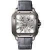 Cartier Santos de Cartier Large Skeleton Black ADLC Men’s Watch WHSA0009. Black ADLC coated steel 47.5mm x 39.7mm case and bezel all on a black leather strap and comes complete with complimentary grey alligator strap. This men’s watch features a black skeleton dial with luminescent coating. Synthetic sapphire crystal glass and water resistant up to 100m. Power reserve up to 72 hours. Manual-wind movement.