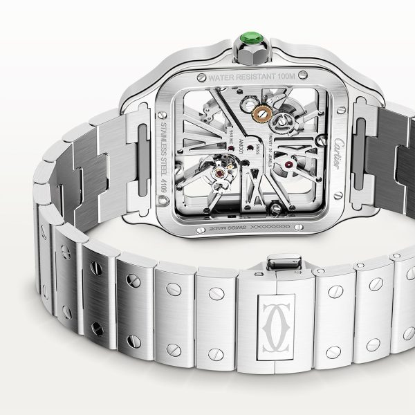 Cartier Santos de Cartier Large Skeleton/Green Dial Men’s Watch WHSA0028. Stainless steel 47.5mm x 39.7mm case and bezel all on a matching stainless steel bracelet and comes complete with complimentary green alligator strap. This men’s watch features a skeleton dial with green jasper structure. Synthetic sapphire crystal glass and water resistant up to 100m. Power reserve up to 72 hours. Manual-wind movement.